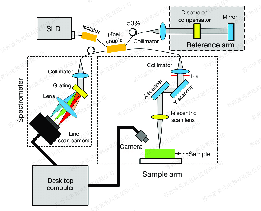 如下圖,常用的SD-OCT系統,基于超輻射發光二極管寬帶光源(SLD光源),光學器件(隔離器,耦合器,準直器,反射鏡,光柵),掃描振鏡(一維、二維掃描振鏡),高速掃描相機(線陣相機、面陣相機),OCT光譜儀,圖像采集卡,數據處理系統等組成。
