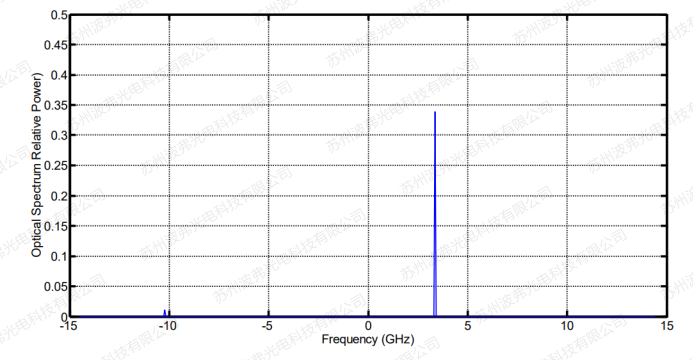 CS-SSB情況下,下圖為強度調制器在Min點時的輸出光譜的模擬計算結果,載波在”0”所處位置消失,±1階邊帶清晰可見,±3階邊帶少許出現。