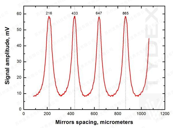圖3顯示了TSFPI對光泵浦總和波激光器的激光波長的測量結果。 從圖中可以看出,相鄰TSFPI傳輸最大值之間的距離約為216 μm(433 μm – 216 μm = 217 μm;647 μm – 433 μm = 214 μm;865 μm – 647 μm = 218 μm),對應于 激光波長的一半。 該結果與理論 TSFPI 透射率最大值一致:λ=2*d/m,其中 d 是以 μm 為單位的 TSFPI 反射鏡之間的間距,m 是干涉階次,λ 是以 μm 為單位測量的波長。