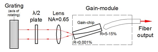 該設(shè)備包括帶有彎曲條紋的“C型”增益芯片。條紋傾斜的刻面專為外部反饋而設(shè)計(jì),并具有深層 AR 涂層,從而使芯片波導(dǎo)的背反射極低。它確保了自激的阻斷,并消除了在外腔系統(tǒng)中操作時(shí)與復(fù)合腔相關(guān)的問題。這導(dǎo)致在整個(gè)調(diào)諧范圍內(nèi)具有高邊模抑制比 (SMSR) 的非常精細(xì)的譜線。具有垂直條紋的刻面具有適當(dāng)?shù)姆瓷渎剩ㄍǔT?5-15% 的范圍內(nèi)),以同時(shí)提供寬波長調(diào)諧和高輸出功率。標(biāo)準(zhǔn)器件中這一方面的反射針對在外腔設(shè)置中的操作進(jìn)行了優(yōu)化,該設(shè)置為芯片提供了有效的反饋(約 50%)(如圖所示)。對于反饋較低的方案,我們建議使用在刻面上具有不同涂層的定制設(shè)備,以提供優(yōu)化的反射。